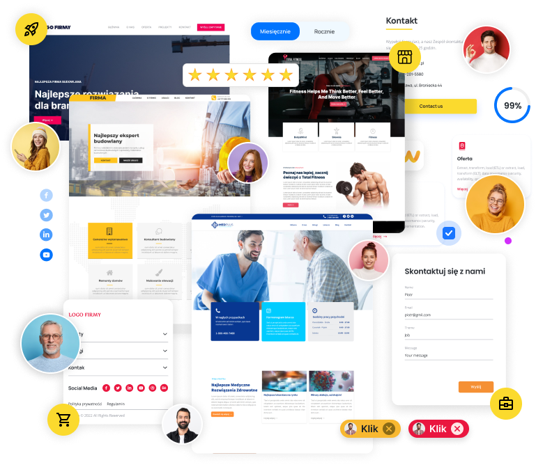 Wszystkie szablony stron internetowych są projektowanie w kreatorze WebWave. Wybierz jeden z kilkudziesięciu pięknych i funkcjonalnych motywów stron www i pokaż się w Internecie.